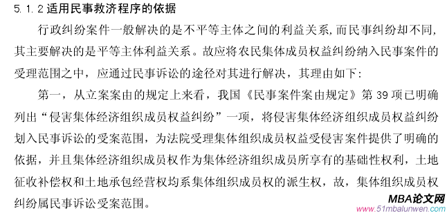 关于成员权纠纷的行政救济,我国《村民组织法》第二十七条规定了基层政府及县区农林行政主管部门按照相关法律规定有权对村集体相关决议进行指导或者纠正,实践中分为两种类型,一是行政机关在集体经济组织召开决议之时,就积极参与协助指导决议程序,监督投票,宣讲政策,这类情况下,效果还是很好的,较少出现侵犯部分成员权益的情况,在这种监督下,因为决议程序较完备,不仅令多数村民信服,而且一旦发生诉讼纠纷,村委会也能够提供较完整的证据材料,有利于纠纷的判定;另一种类型是行政机关事后介入,即部分集体成员发现权益被侵害后,以信访等方式向行政机关反映,要求予以救济,但在实践中此种事后救济手段效果并不理想,一是启动行政救济时,集体决议已经开始执行,有些时候征地补偿款甚至已经按照错误决议发放完毕,即使政府认为决议错误,事后予以纠正的难度也很大,二是法律法规明确赋予了政府机关就集体经济组织在土地发包方面的纠正权,在征地补偿款分配方面,缺乏相关法律支持,因此有些案件中,虽然政府也出具了指导意见,但是村集体没有执行,最后集体成员还是求助于诉讼途径,三是行政机关的信访处理意见不具有终局性,某案件中,因为集体成员多次上访,行政机关出具多份处理意见,由于时间跨度较长,信访负责人员变动较大,导致各处理意见之间还相互矛盾,严重降低了行政救济手段的救济效果。总体上,行政机关提前介入的效果要好于事后介入,但实际案例中,提前介入的案例还是很少的,造成多数情况下,成员权益受侵害时,往往难以通过行政救济手段得到保护。